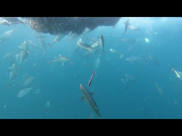 סרטון – התגודדות להקות ענקיות של דגיגים, שחפיות, שחפים ויסעור שטורפים אותם מהאוויר לצד טוניות אטלנטיות שטורפות אותם בתוך הים