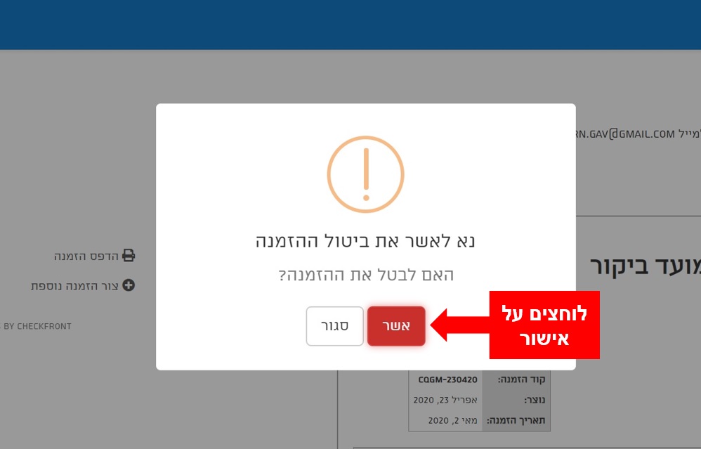 כנס/י לדוא"ל שנשלח אליך מיד לאחר שתאמת ביקור – ולחץ/י על כפתור "ביטול" בחלק התחתון של המייל
