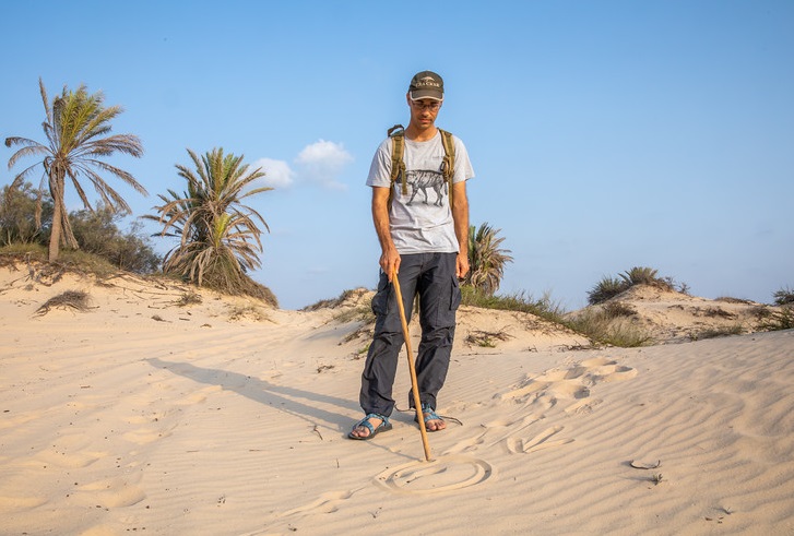 אסף בן דוד, מומחה במעקב אחר חיות בר ובזיהוין באמצעות עקבות, מלקט כך עדויות על עולם החי שלנו – בלי להפריע לבעלי החיים, בלי לכידה ובלי התערבות במהלך החיים שלהם. בדיקת העקבות מהלילה שחלף מניבה שלל עדויות, חלקן מפתיעות בפירוטן: ארבעה צבאים חלפו כאן בהליכה אטית, שתי לטאות חמקו בזחילה מהירה, חיפושיות השאירו פס עקבות עדין, חזיר בר בודד שכב לנוח, ארנבת, כוח אפור. בליל של עקבות וסימנים בחול מעיד על קרב לחיים ולמוות בין שועל למכרסם קטן – כנראה גרביל, ובעקבות פענוח הסימנים בשטח המסקנה ברורה – רק אחד מהם יצא בשלום מהמפגש הלילי.
