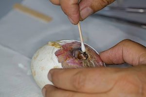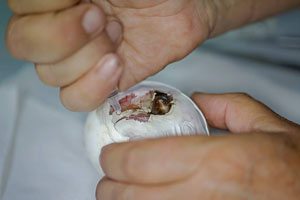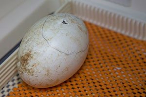 הביצה הגיעה במצב לא טוב ויגאל הבין שיש בעיה: "הביצה הגיעה במצב רעוע, מיד זיהיתי שיש איזשהו פגם מולד בגוזל, בגלל שחילצו אותה בפתאומיות, היה קשה לתארך את גילה או תאריך הבקיעה. אבל לאט לאט הבנתי שמדובר בגוזל מיוחד, הוא היה פעיל והיפראקטיבי ועקבנו אחריו ע"י מצלמת מעקב 24 שעות ביממה". אחרי ימים מתוחים הבחינו עובדי החי בר בתזוזות בביצה ושמעו את צליל הבקיעה המיוחל (כשגוזל בוקע הוא עושה חור בביצה וזה מסמל את תחילת תהליך הבקיעה) בשעות הערב בקע הגוזל, היה סיבוך קל והגוזל התקשה לצאת (נדבק לאחת מדפנות הביצה) יגאל עזר לו לבקוע ולגוזל שלום.