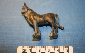 "את מגלה המתכות הפעלתי יחד עם הפועל המסור אבו-חמד. באחד הימים אבו חמד מצא מסמר ומטבע מעל הרצפה, אך מגלה המתכות המשיך לצפצף גם לאחר מכן. הוא ניקה את רצפת הבריכה היצוקה מבטון עתיק בכדי לזהות מהיכן מגיע הצפצוף, אך הצפצוף התמיד גם כאשר הרצפה הייתה נקייה – וכך הבנו שחפץ המתכת נמצא בתוך הבטון עצמו. סימנו נקודת שבירה ברצפה ואחרי שנוצר חור בגודל של כחמישה ס"מ עצרנו כדי לבדוק את השברים במגלה המתכות. אחד השברים לא רק ציפצץ אלא גם חשף צורה מיוחדת אותה זיהינו בהתלהבות והתרגשות כפסלון של פר מברונזה", מספר אחיה כהן-תבור, דוקטורנט באוניברסיטת אריאל שהיה שותף לניהול החפירה.