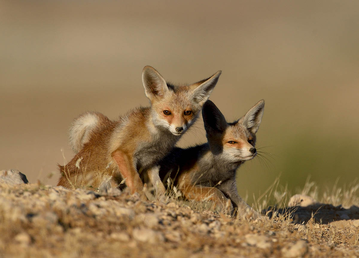 גורי שועל מצוי מתחממים בשמש בפתח מחילתם בנגב המערבי