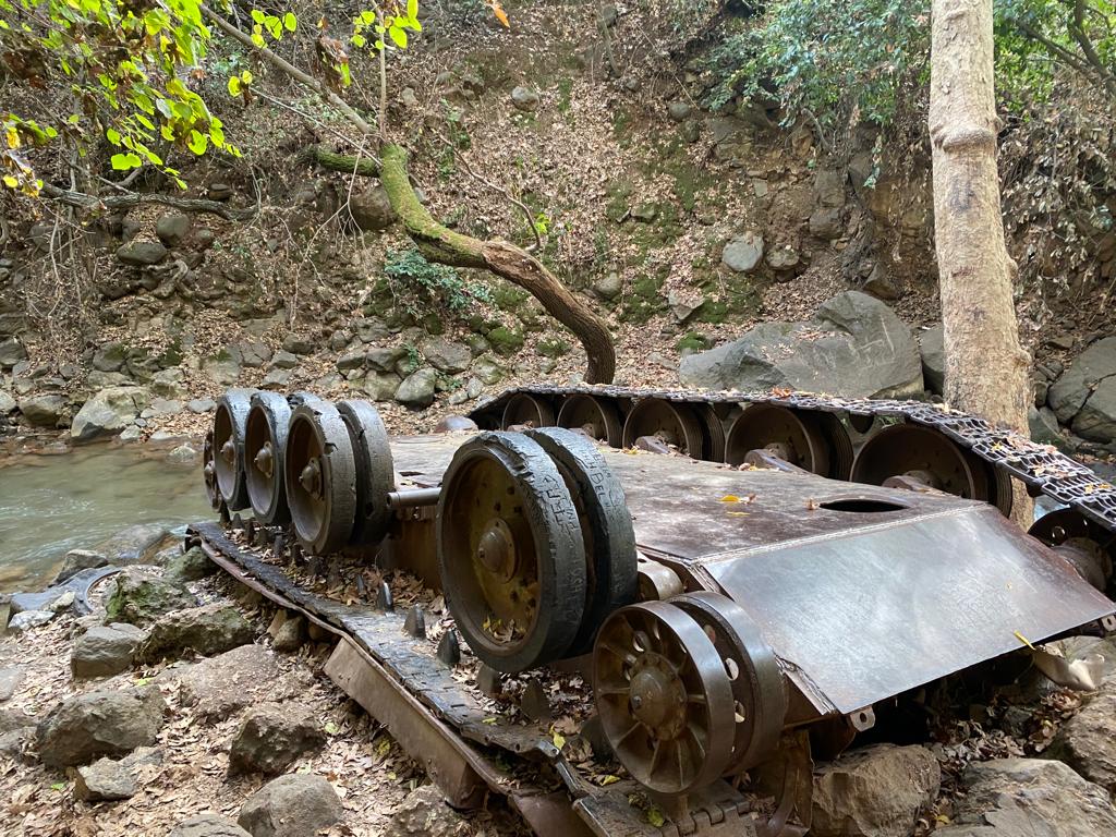 סימון שבילים ירוק יוביל אותנו במגמת ירידה אל אפיק הנחל, במפגש עם סימון שבילים שחור נפנה שמאלה ונרד במדרגות אל הטנק ההפוך, זהו טנק סורי מימי מלחמת ששת הימים שלקח חלק במתקפה על קיבוץ דן. תוך חילופי ירי עם הכוח המגן מקיבוץ דן, נסוג הטנק אחורה ונפל אל ערוץ נחל הבניאס ומאז הוא כאן.