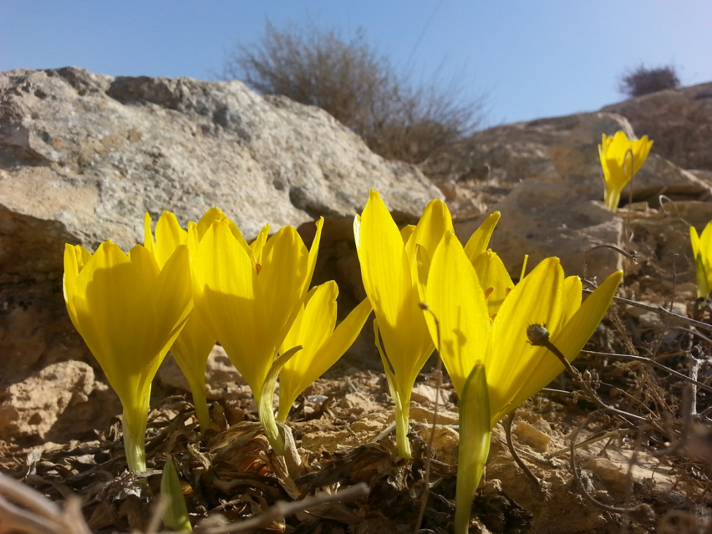 פרחי החלמוניות הצהובים מנקדים בסתיו את אדמת המדבר היבשה ברכס בוקר בשמורת טבע מצוק הצינים שבנגב. צילום גל ביסמוט, צילום: גל ביסמוט