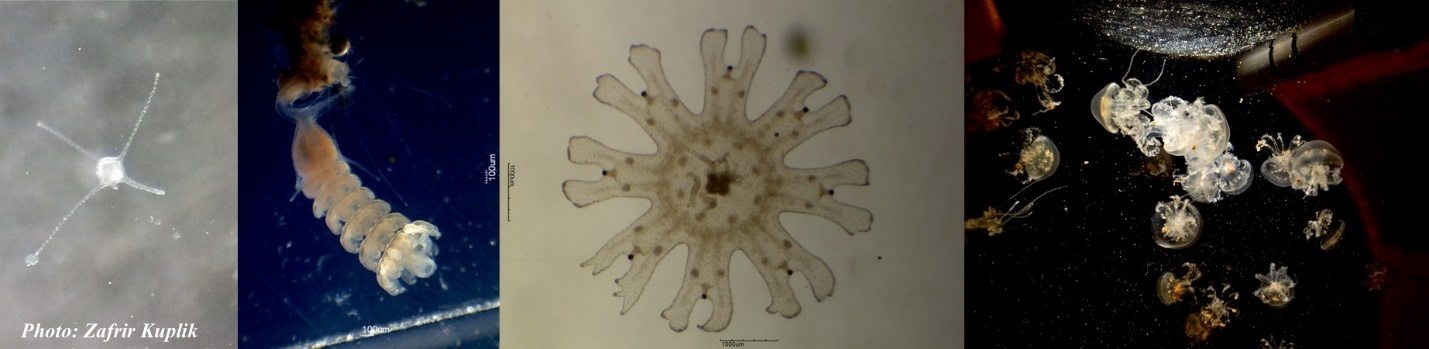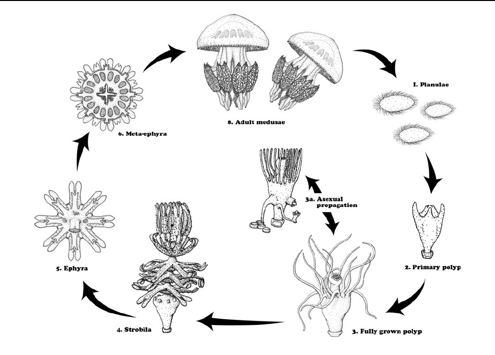 משמאל לימין: שלב הפוליפ היחיד זמן קצר לאחר היווצרותו; פוליפ נושא מדוזות זעירות (ephyrae) טרם שחרורן לגוף המים (בשלב זה הפוליפ קרוי 'סטרובילה' = strobila); אפירה יחידה לאחר התנתקותה (קוטר כ-5 מ"מ); חוטיות צעירות בנות כמה שבועות (הצבע הכתום הנראה בתוך המדוזות הוא שיירי המזון בו הואכלו המדוזות– סרטנים פלנקטוניים מסוג 'ארטמיה').