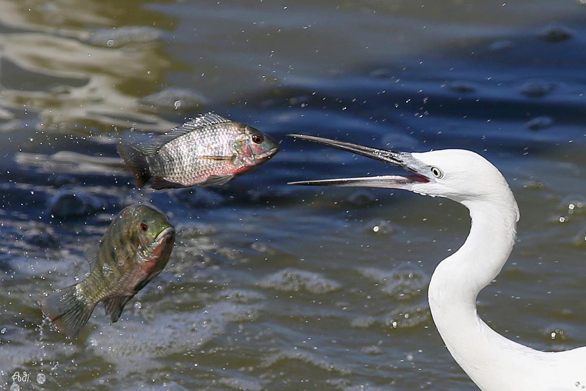עין בעין – אנפה לבנה פוגשת את הטרף שלה, שקפץ לרגע מהמים