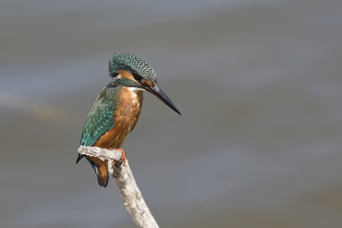 רגע של שקט – שלדג גמדי צופה אל מימיה של בריכת דגים מלאכותית ביום סגרירי