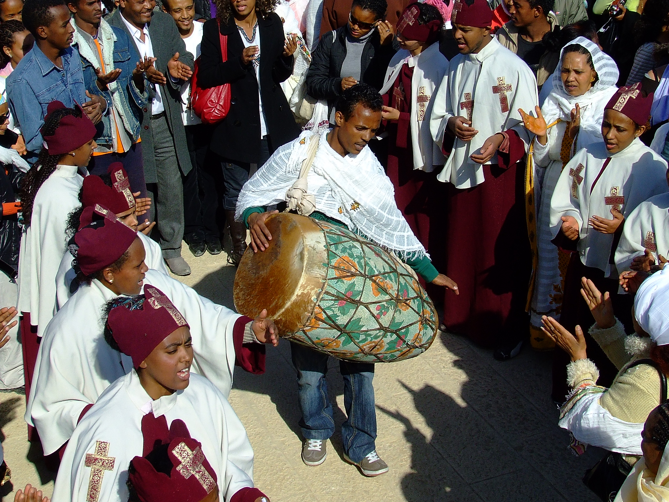 בבוקר החג יורדים אל הירדן הנזירים האתיופים לבושים במדים המסורתיים ואחריהם אלפי צליינים, תוך שירה וריקודים לקול הלמות התופים. מיד אחריהם שיירה ובראשה הפטריאכך היווני אורתודוכסי מלווה בנזיריו, והמון רב המלווה אותם בתופים חלילים ושירה