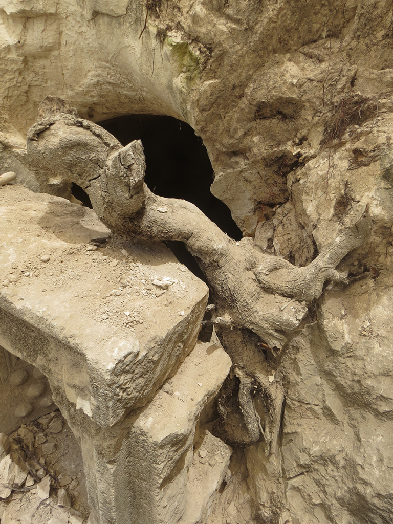 ברבות השנים התברר שהצמחייה הצעירה שניטעה מעל מערות הקבורה הפכה לחורש עבות של מאות עצים, והם שולחים למטה שורשים ארוכים – עד עומק כ-20 מטרים. השורשים חודרים לתוך סלע הקירטון הרך, האופייני לאזור, מבקעים בו סדקים ומרחיבים אותם, וכך מתחולל תהליך איטי של פירוק מערות הקבורה העתיקות וקריסתן. כיום ניתן להבחין בקלות בשורשי העצים הפורצים מתוך תקרות המערות וקירותיהן.