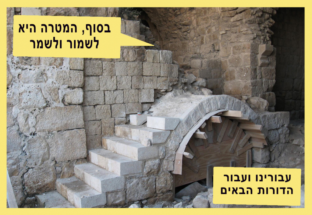 לכן, בפעם הבאה שתראו חומה עתיקה, תל אבנים, בור מים או כל ממצא הסטורי אחר, אל תדלגו עליו כל כך מהר. יש לו סיפור לספר. ואם ראיתם במקרה איש או אישה עם אזמל, כפפות וחומר מסתורי ביד, אל תיבהלו, זה רק המשמרים שלנו, עובדים גם בשביל הדורות הבאים.