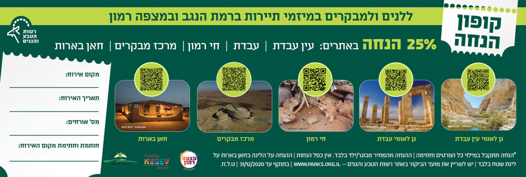 כל מטייל שיבקר באחד מאתרי הר הנגב (באזור שדה בוקר ומצפה רמון) : חניון בארות | מרכז המבקרים מכתש רמון | חי רמון | גן לאומי עבדת | גן לאומי עין עבדת, יקבל באתר הנוסף הנמנה על אתרים אלו 25% הנחה במהלך 24 השעות מתחילת הביקור הראשון באחד האתרים ברשימה. זאת בכפוף להצגת קבלה על תשלום באתר הראשון.
