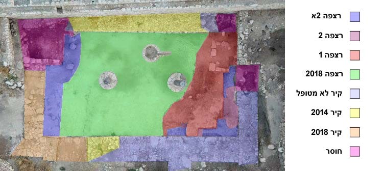 מערכת חתכים ארכיאולוגיים שחשפו את רצפה 2/2א, השאירה את שרידי רצפה 1 כאי מוגבה, מוקף בתשתיתו החשופה. תשתית זו מורכבת מאדמה
