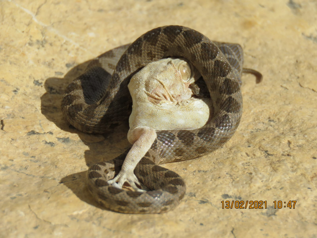 הנחש תכנן ארוחה, אך הלטאה הייתה חזקה וגדולה מדי.