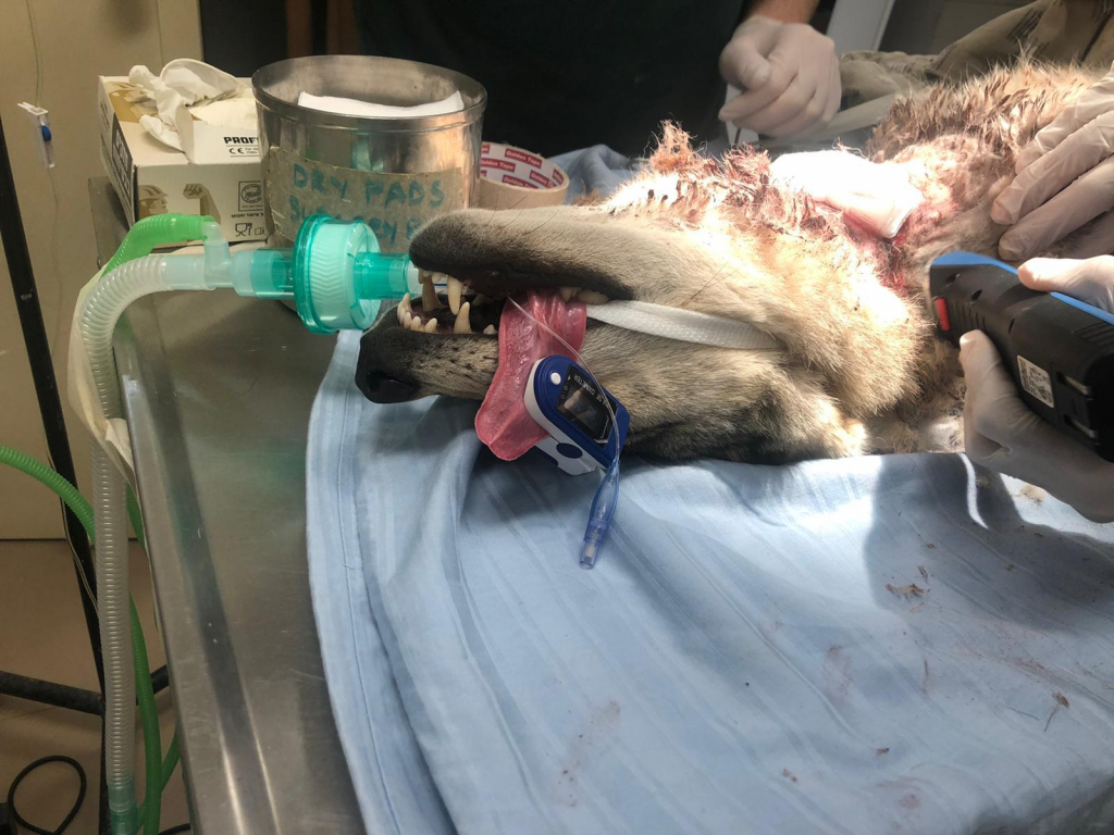 הזאב הורדם לצורך ניתוח שנמשך כשעתיים במהלכו תפר ד"ר ניצן אדם וטרינר בבית החולים את השרירים תת העור והעור לגופו הוחדרו נקזים כדי לאפשר לדלקת ולנוזלים לצאת החוצה. הזאב קיבל אנטיביוטיקה לוריד, תרופות לשיכוך כאבים ותרופות הרגעה.
