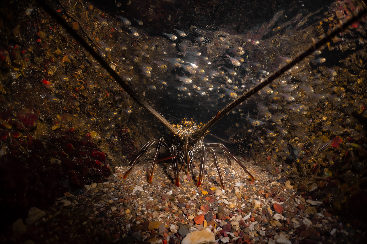 סרטן מחושתן במפרץ אילת ומעליו להקת דגי גרזינונית עדינה – צילום עמרי יוסף עומסי רשות הטבע והגנים
