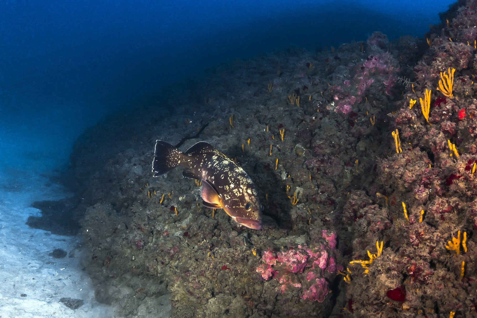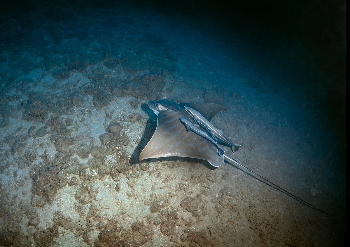 טחן פרי (עטלף ים) מלווה על ידי זוג דבקים נצמדים, באזור אתר הצלילה "הגוררת" בשמורת ים ראש הנקרה-אכזיב.
